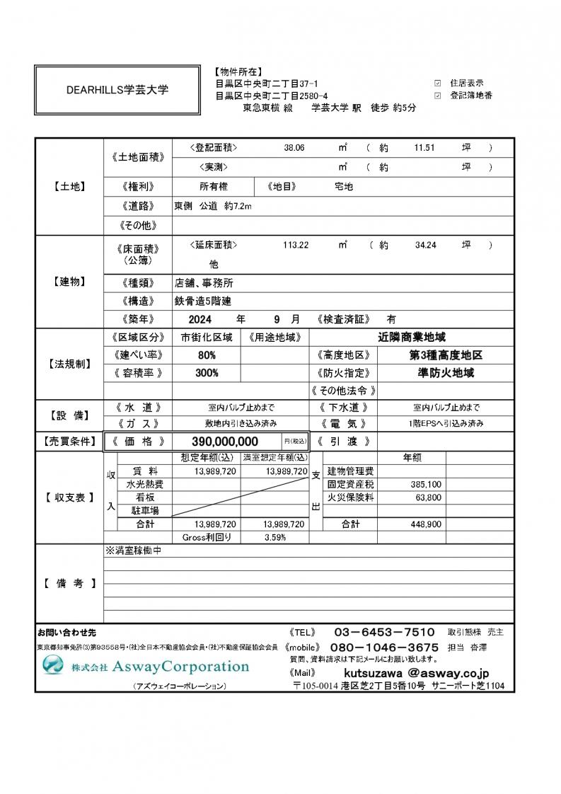 2026 年 1 月 23 日公開 DEARHILLS学芸大学 所在 目黒区中央町2丁目 交通 東急東横線 学芸大学駅 徒歩約5分 土地 38.06㎡ 建物 鉄骨造5階建 延床面積113.22㎡ 令和6年9月新築 想定年収 1,398.9万円(税込) 価格 3億9,000万円(税込) 表面利回り 3.59% 現況 満室稼働中 コメント ◎詳しくは弊社へ直接お問い合わせください◎◎ご不明点もお気軽にどうぞ!お待ちしております◎